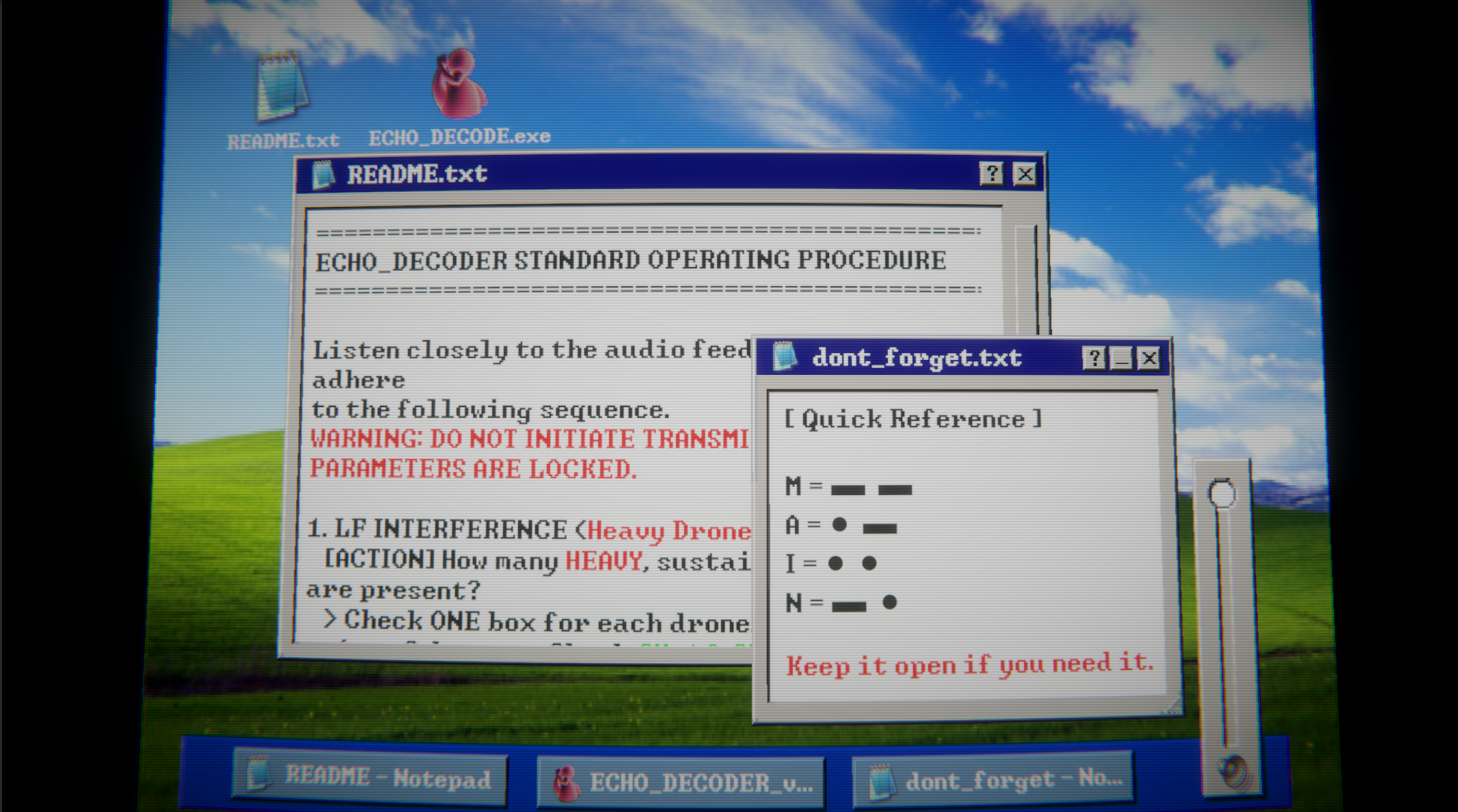 cheat_sheet.txton your virtual desktop. It is the only asset left by your predecessor. - Escalating Interference: As you delve deeper into the nodes, audio corruption will spike exponentially. Maintain focus.
